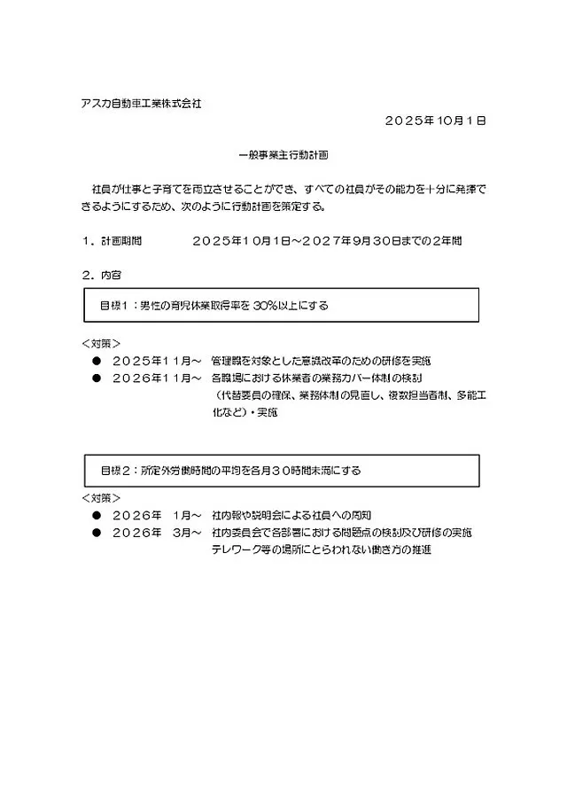 千葉市若葉区 一般事業主行動計画 アスカ自動車工業